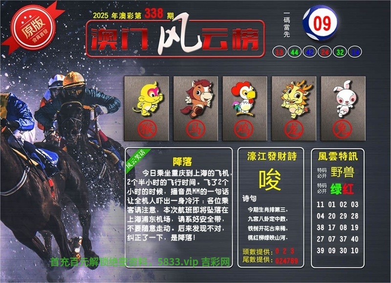 | 334期:六肖中特〖鸡猴龙马兔羊〗开:猴46准 |